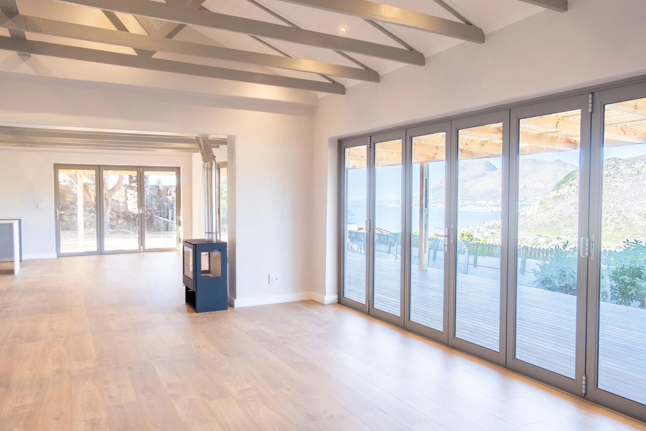 Doprop reimagined the space completely. The interior was opened up to draw in natural light and frame sweeping views of both the ocean and the mountain, creating a home that feels immersed in its landscape. Outside, we added new decking and entertainment areas designed to embrace the coastal lifestyle—perfect for long summer evenings overlooking False Bay.